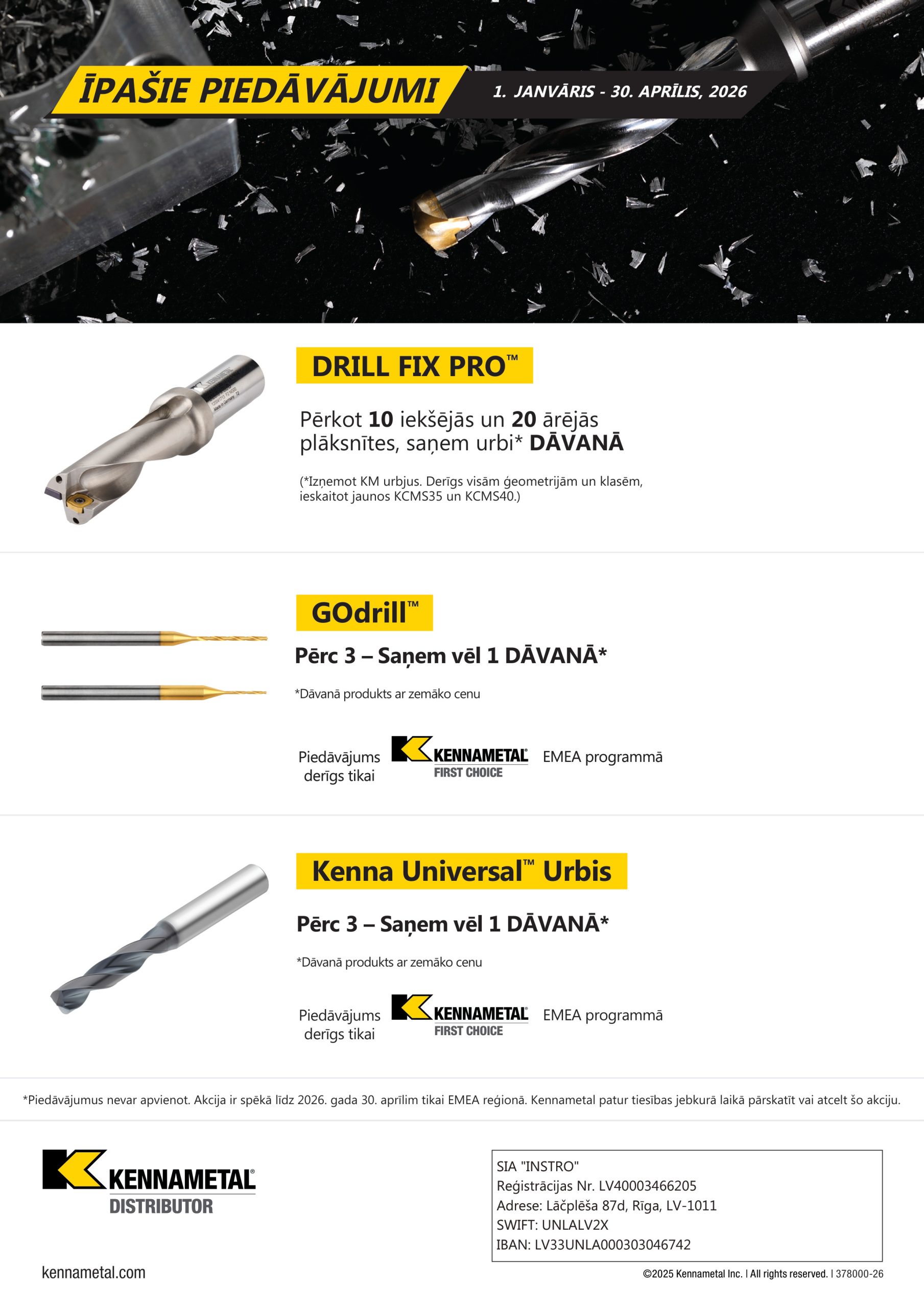KENNAMETAL ĪPAŠIE PIEDĀVĀJUMI (01.01. – 30.04.2026.)